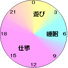遊び、睡眠、および仕事から成り立っている。平日におけるその内訳はおおよそ以下の通りである。